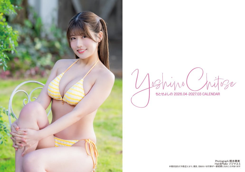 3月8日(日)『ちとせよしの2026.04-2027.03カレンダー』リリースイベントで先行発売された卓上カレンダーが通常販売を開始致しました。 数量に限りがございますので、お早目のご購入をおすすめ致します。 商品サイズ:H125mm×W182mm×D80mm ※商品がなくなり次第、販売終了とさせていただきます。 ※現状、追加生産の予定はございません。予めご了承ください。 ―――――――――――――――――― 【PROFILE】 ちとせ よしの:Yoshino Chitose 2000年1月8日生まれ。SPJ Entertainment所属。 T158/B95/W65/H98。 佐賀県出身。血液型A型。 アイドルグループ「あまいものつめあわせ」ピンク担当。 https://www.spj-idol.com/ X https://x.com/chitose_yoshino Instagram https://www.instagram.com/chitose_yoshino/ YouTube https://www.youtube.com/channel/UCFKnWk6MsWNf6g6ky2OSYGA ※記載情報は2026年3月時点のものです。 ―――――――――――――――――― 【ご予約商品と通常商品の同時注文について】 予約商品とこちらの通常販売商品を一緒にご注文の場合、予約商品の入荷後の発送となります。予めご了承ください。